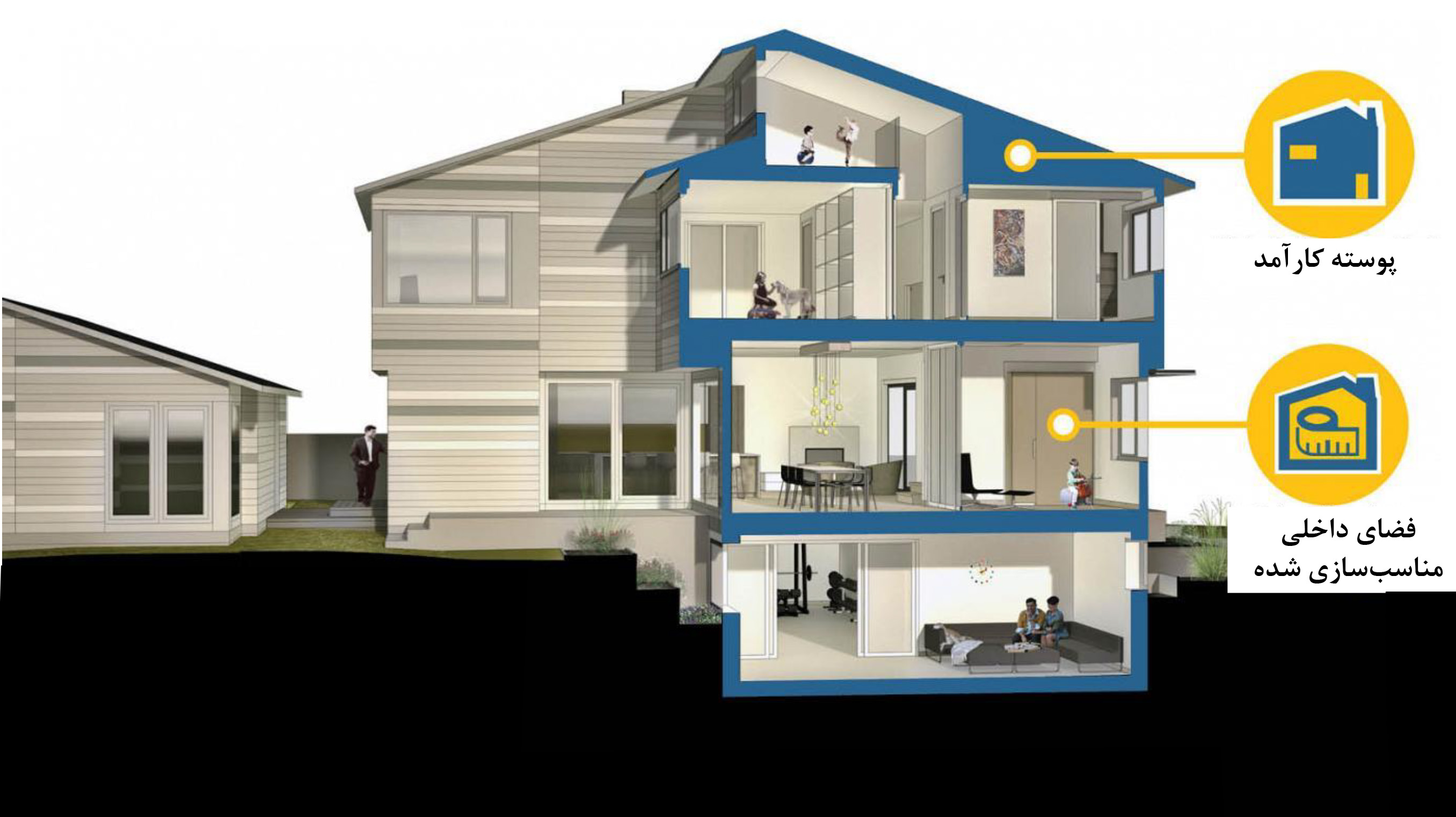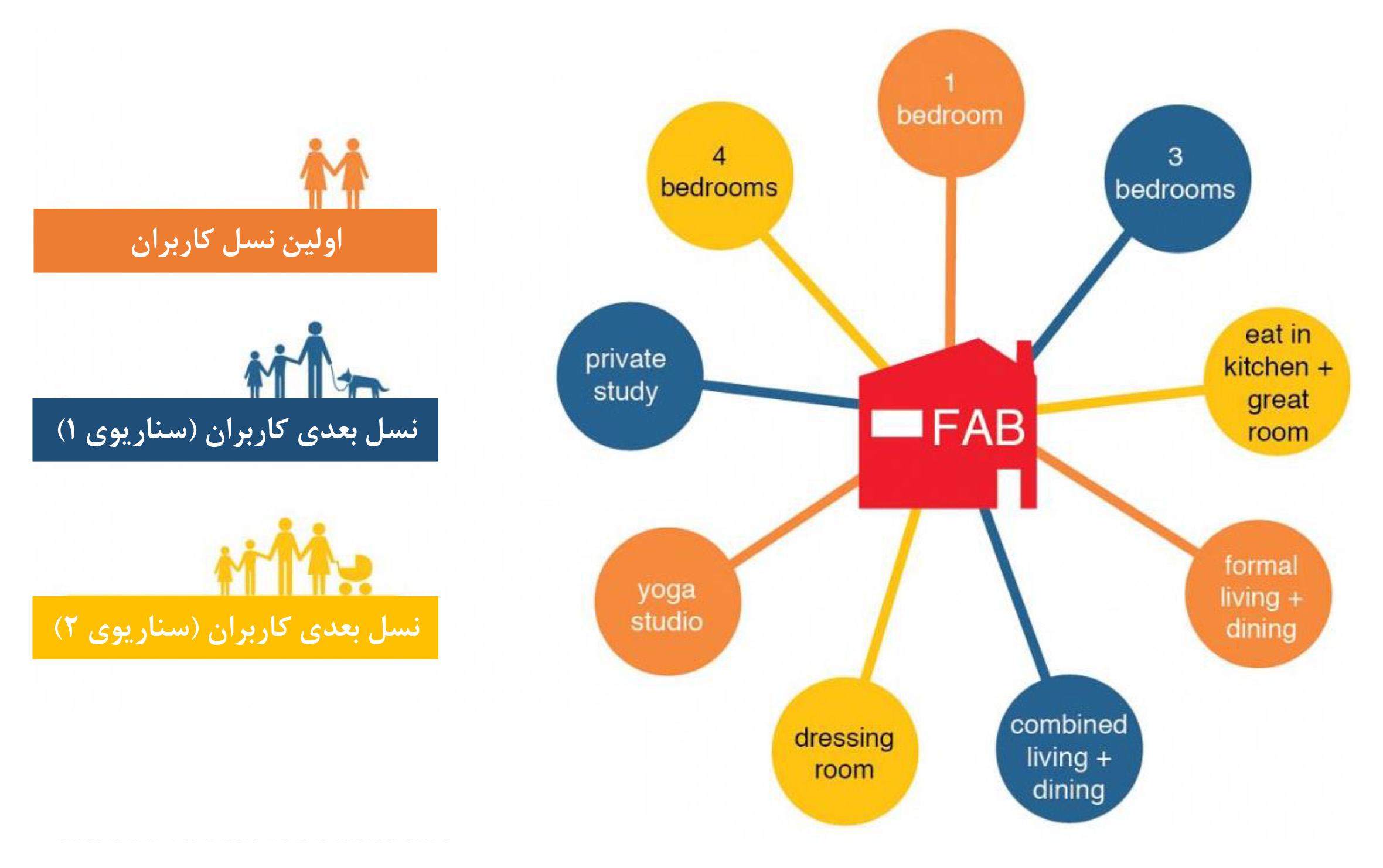 با این رویکرد برای خانهای که با سه اتاق خواب و یک اتاق لباس بزرگ طراحی شده ۳ آلترناتیو برای گروههای بعدی کاربران احتمالی پیشبینی شده که در ادامه قابل مشاهده است: