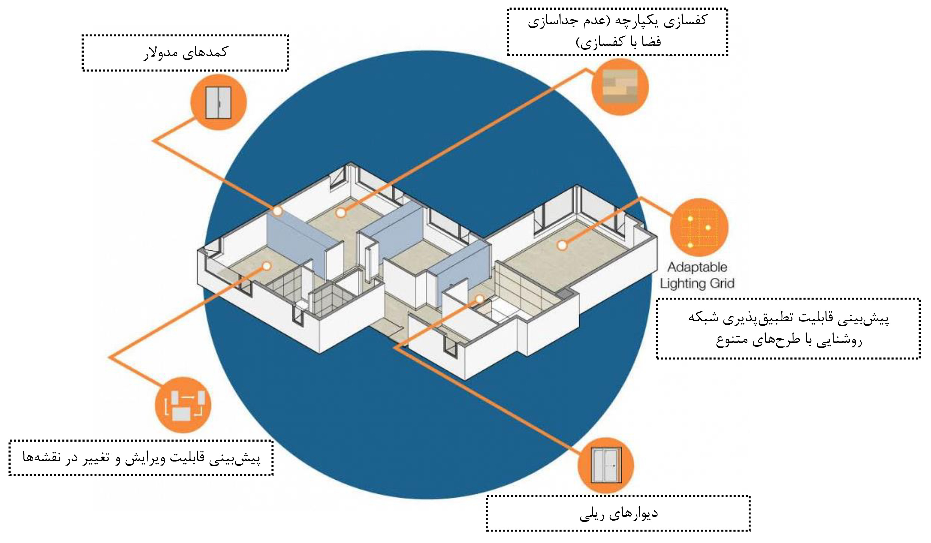 در زمینه ساماندهی فضای داخلی، انعطافپذیری هدف اصلی این گروه است. با طراحی پلانهای باز و مدولار، استفاده حداقلی از دیوارهای ثابت و در مقابل، جداسازی و تعریف فضا با دیوارهای ریلی و کمدهای مدولار، آرایش های فضایی متنوع و پاسخگویی به نیازهای متفاوت کاربران مختلف ممکن میشود.