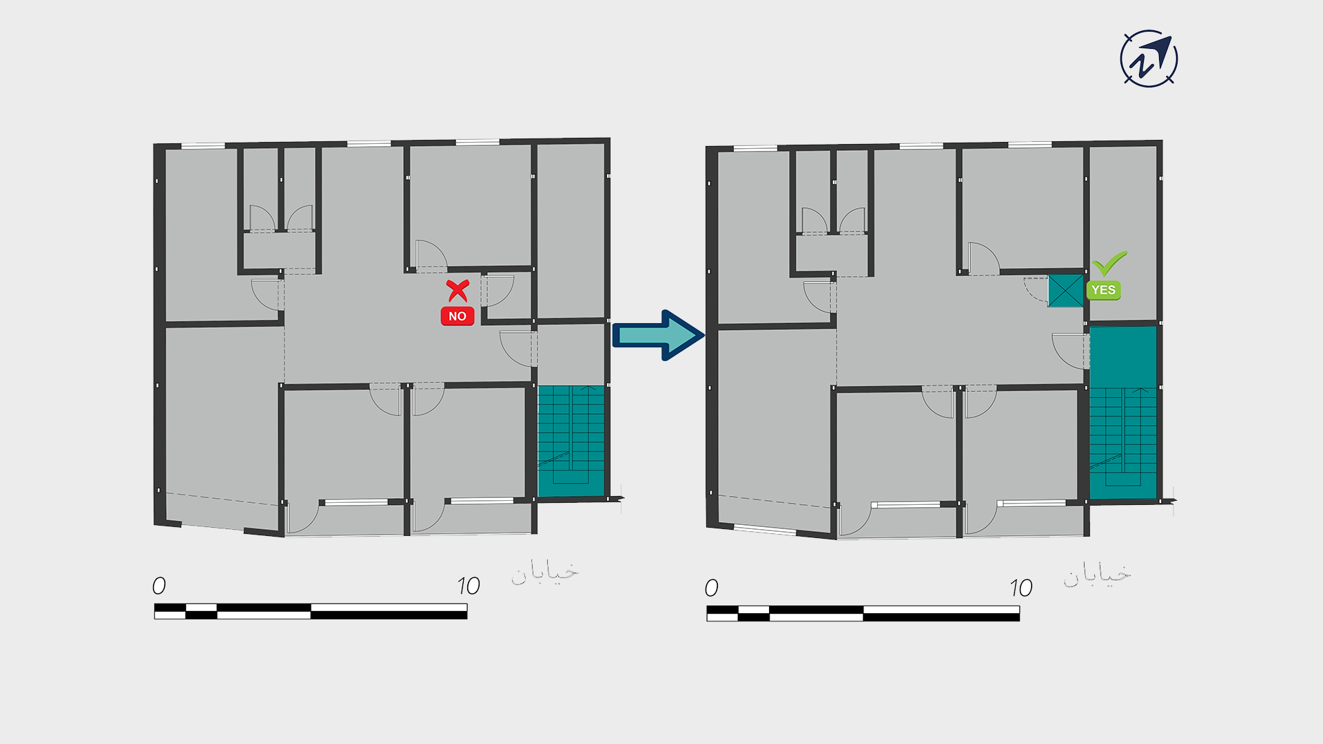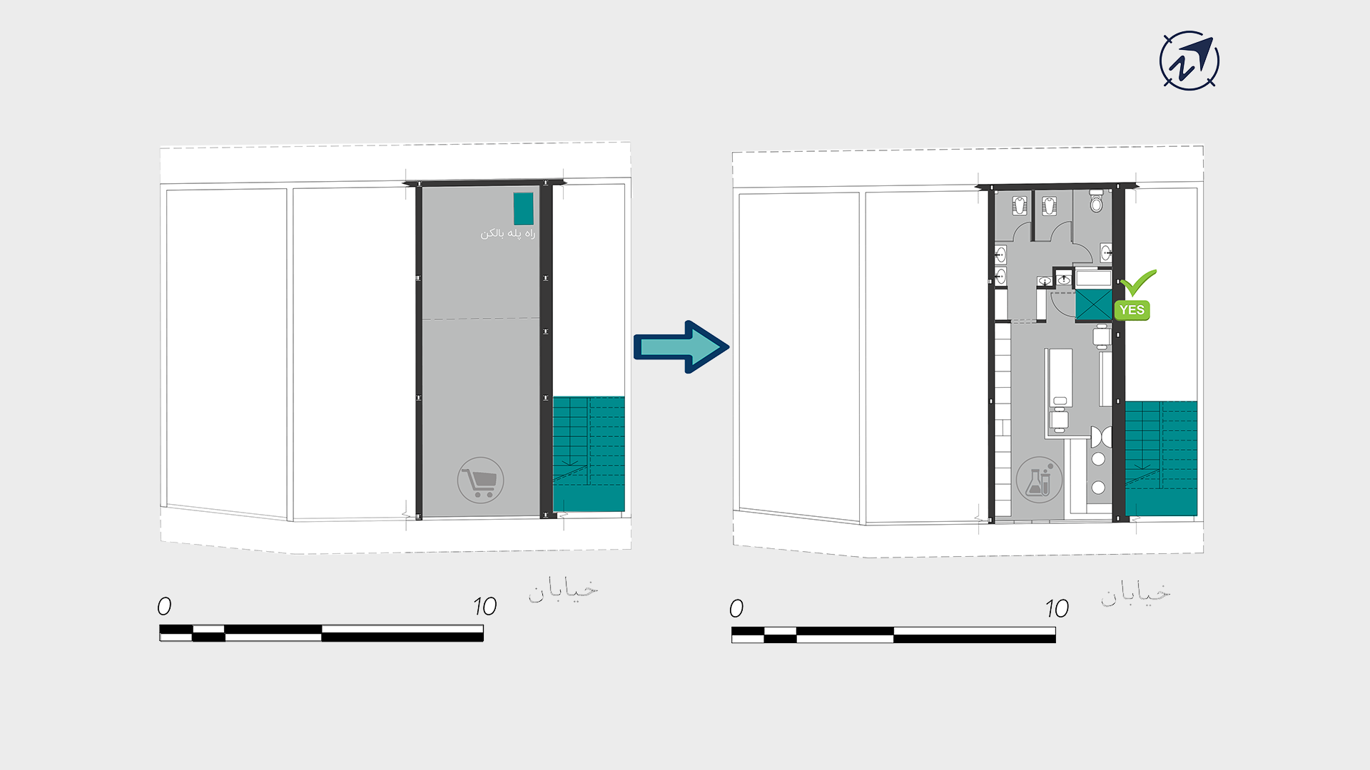 در این پروژه به دلیل انجام فرایند بازسازی وعدم امکان توقف فعالیتهای آزمایشگاه، پیشبینی فضای نمونهگیری در همکف و ایجاد دسترسی آسان بین بخش نمونهگیری و لابراتوار در دستور کار طراحان قرار گرفت و در نهایت پاسخگویی بهینه به نیازها باعث افزایش تعداد مراجعان شده و با آورده مالی قابل توجهی برای کارفرما همراه شد.